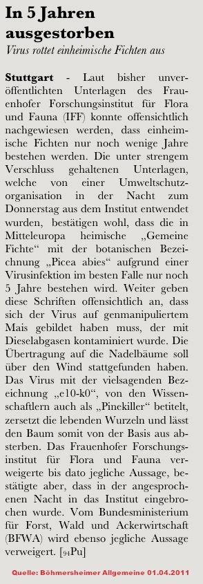 Die unter strengem Verschluss gehaltenen Unterlagen, welche von einer Umweltschutz- organisation in der Nacht zum Donnerstag aus dem Institut entwendet wurden, bestätigen wohl, dass die in Mitteleuropa heimische „Gemeine Fichte“ mit der botanischen Bezeichnung „Picea abies“ aufgrund einer Virusinfektion im besten Falle nur noch 5 Jahre bestehen wird. Weiter geben diese Schriften offensichtlich an, dass sich der Virus auf genmanipuliertem Mais gebildet haben muss, der mit Dieselabgasen kontaminiert wurde. Die Übertragung auf die Nadelbäume soll über den Wind stattgefunden haben. Das Virus mit der vielsagenden Bezeichnung „e10-k0“, von den Wissenschaftlern auch als „Pinekiller“ betitelt, zersetzt die lebenden Wurzeln und lässt den Baum somit von der Basis aus absterben. Das Frauenhofer Forschungsinstitut für Flora und Fauna verweigerte bis dato jegliche Aussage, bestätigte aber, dass in der angesprochenen Nacht in das Institut eingebrochen wurde. Vom Bundesministerium für Forst, Wald und Ackerwirtschaft (BFWA) wird ebenso jegliche Aussage verweigert. [94Pu]