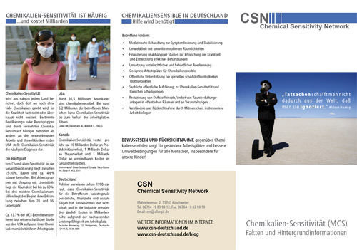 Die Erkrankung Chemikalien-Sensitivität (MCS) ist nach wie vor für viele Menschen etwas Neues, von dem sie bisher nie oder nur wenig gehört haben. Auch Ärzte sind oft mit der Erkrankung überfordert, da sie in ihrer Ausbildung davon nichts erfuhren. Die neue CSN Info-Broschüre über Chemikalien– Sensitivität soll mithelfen sachliche Informationen über die Erkrankung zu verbreiten. Hier können Sie sich die Broschüre downloaden: CSN Info-Broschüre Es ist gestattet den CSN Flyer in unveränderter Form auszudrucken und zu verteilen. Wer eine größere Anzahl benötigt, kann die Datei auf eine CD brennen und in einem Copyshop eine beliebig hohe Anzahl ausdrucken lassen. Wir wünschen Ihnen viel Erfolg beim Verteilen in Ihrem Umfeld, Ihr CSN Team